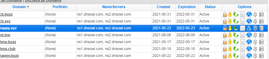 四,付款后点击顶部的菜单“Manage My Domains”项会出现你所购的域名列表,此时你可以将你所购的域名指向某个IP